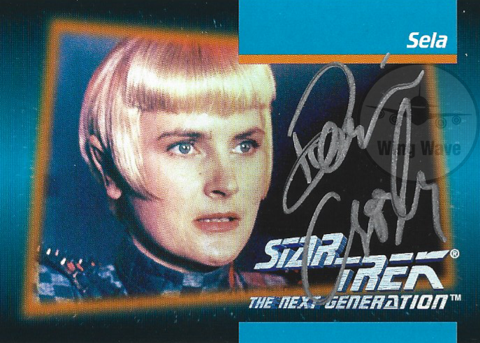 Card #028 features Sela, the cunning and calculating Romulan officer portrayed by Denise Crosby in one of her most iconic return roles to the series. Signed by Crosby herself, this autographed collectible celebrates her dual legacy in Star Trek as both Tasha Yar and her half-Romulan daughter, Sela—a character who left a lasting mark on the show’s rich storyline.