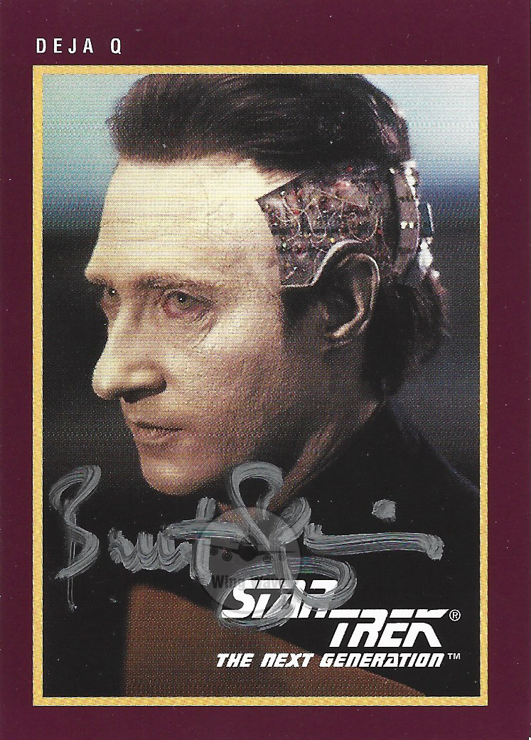 From the fan-favorite episode “Deja Q,” this autographed card captures Data’s compassion for the powerless and his quiet heroism in aiding a fallen Q. Signed by Brent Spiner, the card commemorates one of the android’s finest character moments—his unshakable empathy even in the face of omnipotence.